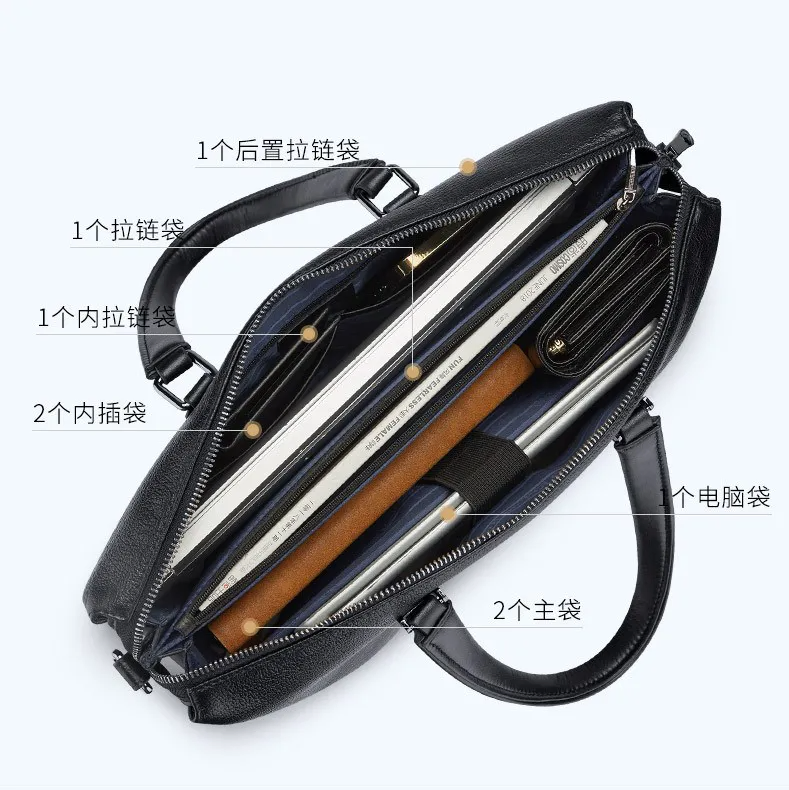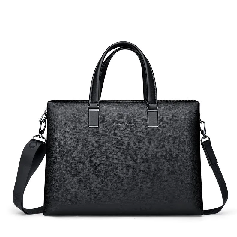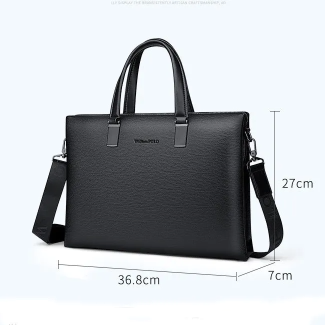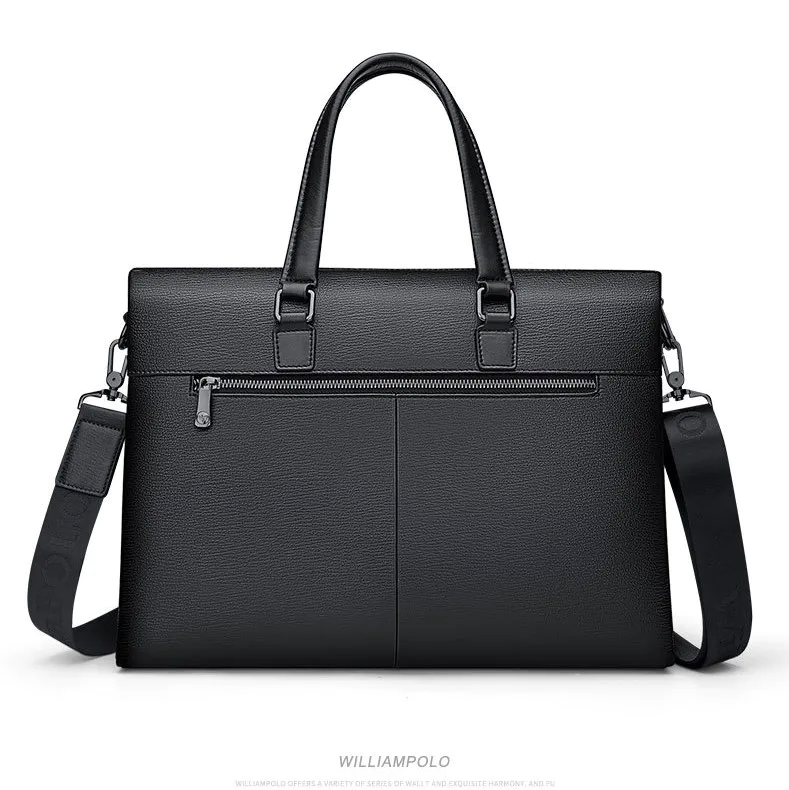 Color: BlackBrand: William POLOUpper Material: Genuine LeatherNumber of Shoulder straps: SingleOpening Method: ZipperShape: HandbagHardness: SoftPattern: Solid ColorLining Material: PolyesterSize: 36.8 cm * 27 cm * 7 cmFeatures: Multi-function, 14” Computer CompartmentWeight: 1 kg